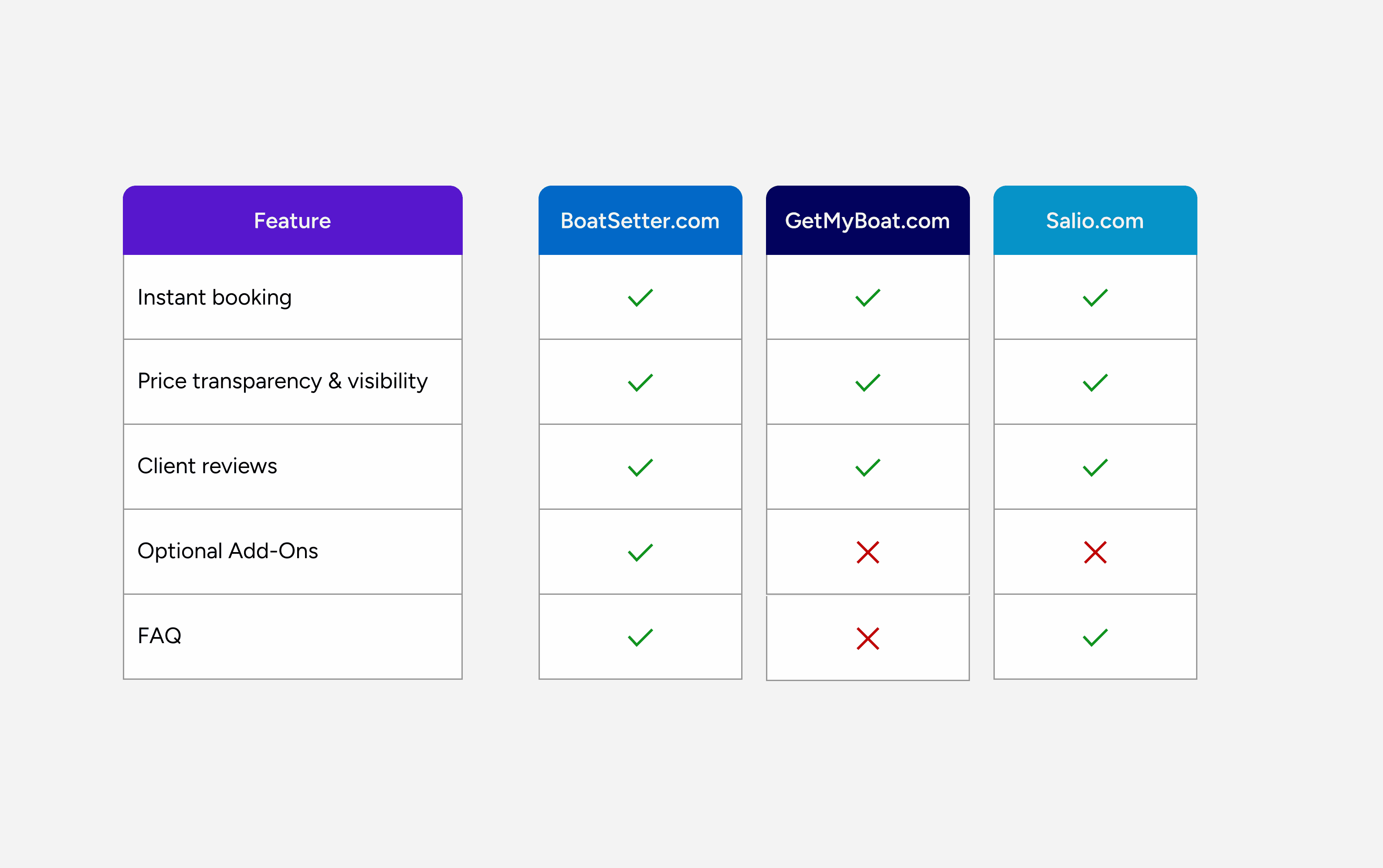 I reviewed top boat rental platforms like Boatsetter, GetMyBoat, and Sailo to understand how users plan trips. While fleets are presented clearly and direct booking is supported, optional services and upgrades are rarely offered or surfaced, and one platform didn’t even include an FAQ section, reducing transparency and user confidence. This highlighted a clear opportunity to showcase add-ons, clarify services, and provide structured guidance, creating a more confident and curated planning experience.