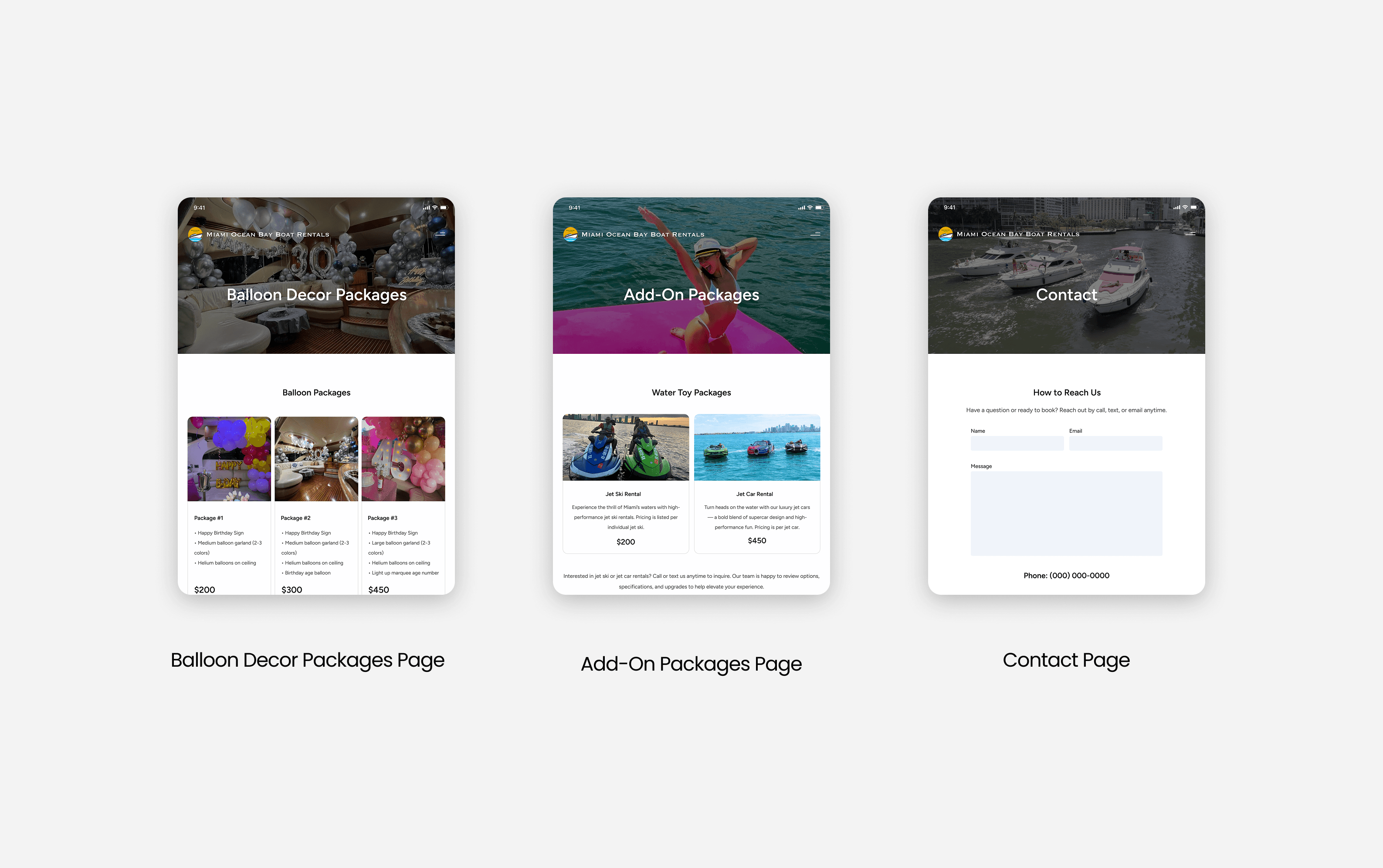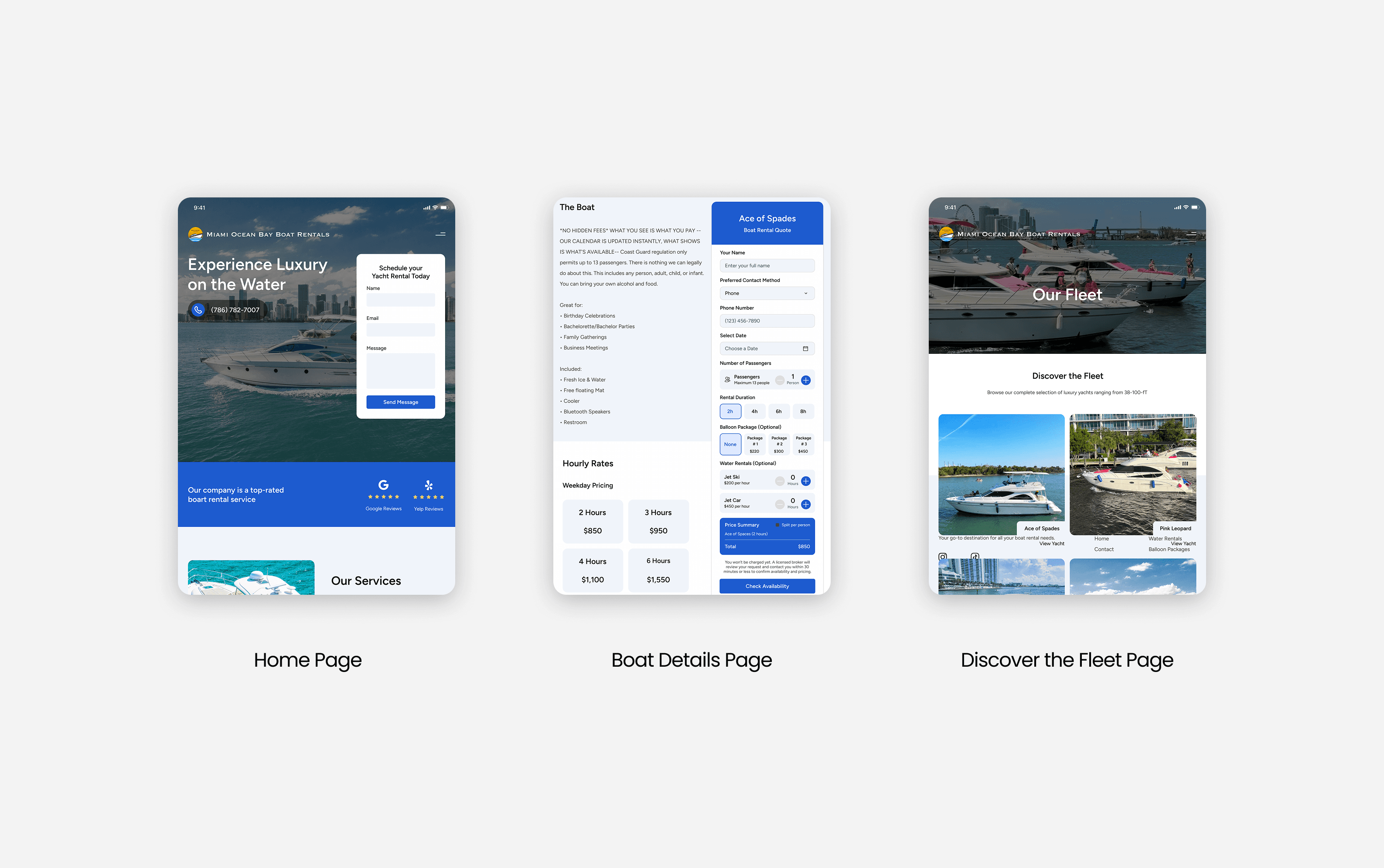 Miami Ocean Bay Boat Rentals helps users explore yachts and plan experiences while all bookings must go through a broker. Users often faced uncertainty when estimating total costs, exploring optional extras, and navigating the expanding fleet. The goal of this project was to reduce friction, clarify pricing, and provide a scalable, intuitive platform that supports confident inquiry without allowing direct booking.