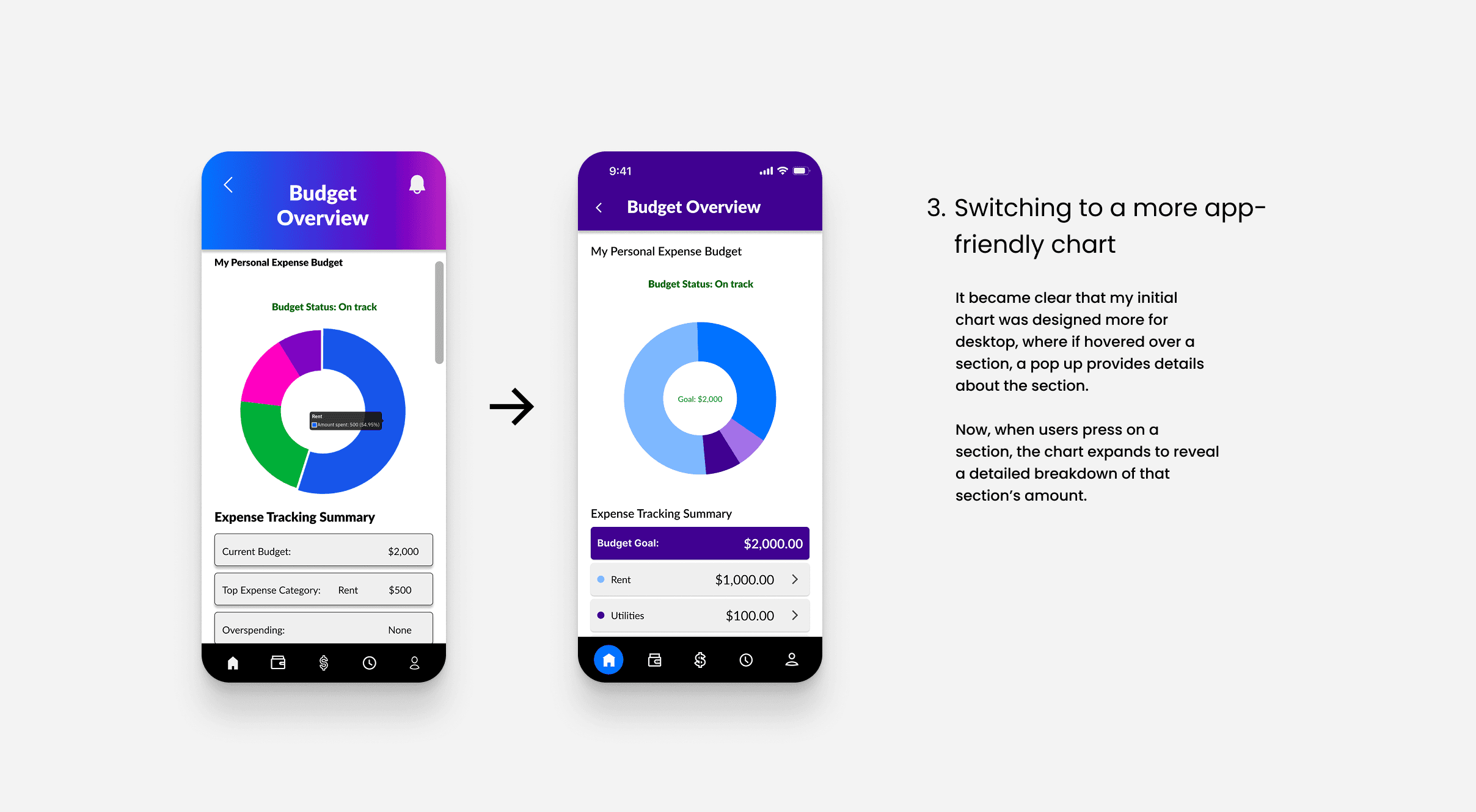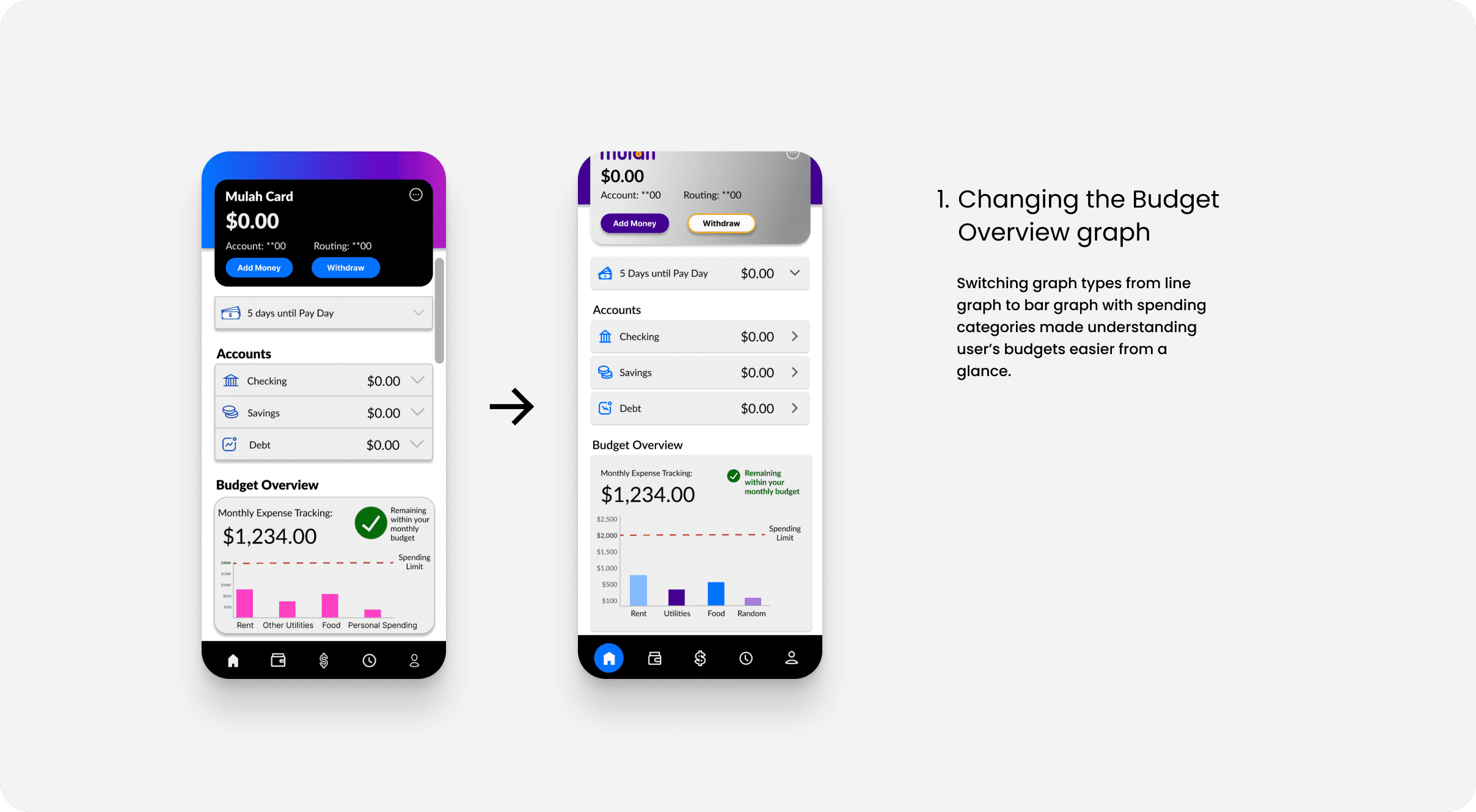 Initially, I spent a week trying to decide which of the following approaches to streamlining financial management was most effective: AI financial chat bot assistance, in-app educational microcontent, or a personalized financial health dashboard. Ultimately, I chose the dashboard because it best supports the goal of consolidating and simplifying how users interact with their money while letting users feel in control.Improvements